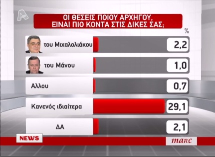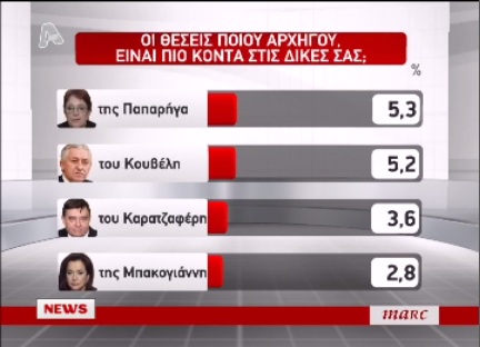 Στην ερώτηση “οι θέσεις ποιου αρχηγού είναι πιο κοντά στις δικές σας” το 16,1 των ερωτηθέντων απάντησε εκείνες του Αντώνη Σαμαρά, το 15,6% απάντησε εκείνες του Ευάγγελου Βενιζέλου. Ακολουθεί ο Αλέξης Τσίπρας με 9.8% και ο Πάνος Καμμένος με 6,5%, ενώ είναι χαρακτηριστικό ότι το 29,3% των ερωτηθέντων απαντά ότι κανενός αρχηγού οι θέσεις δεν είναι ιδιαίτερα κοντά στις δικές του.