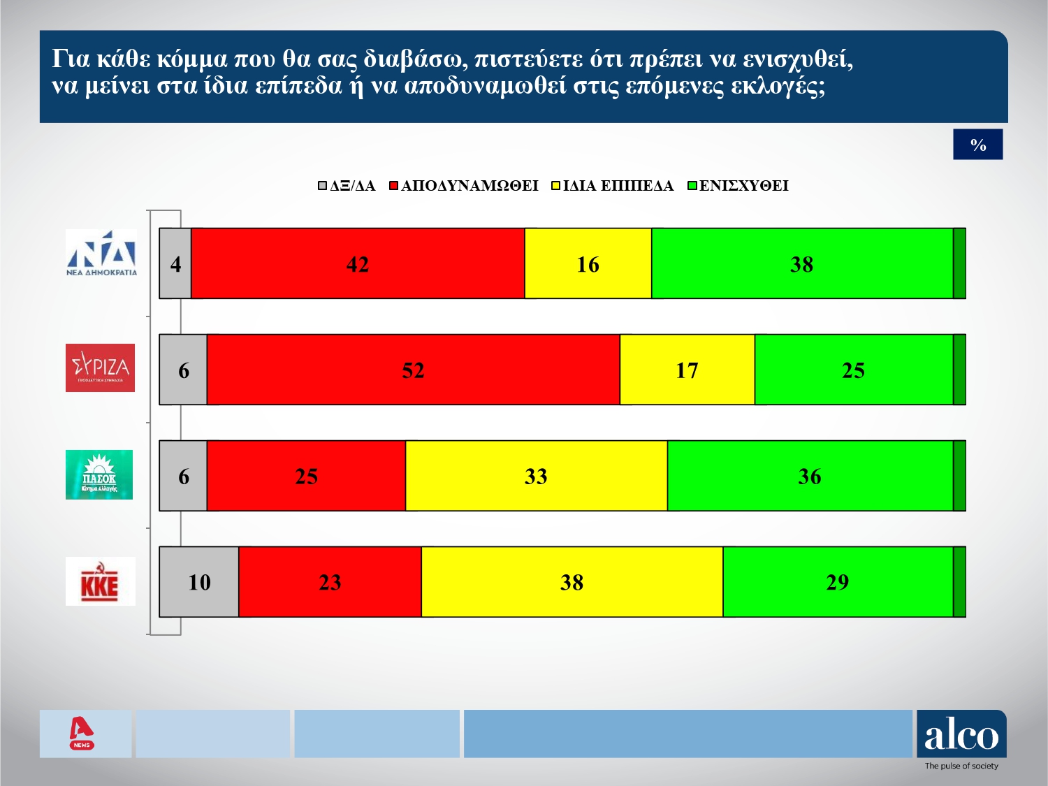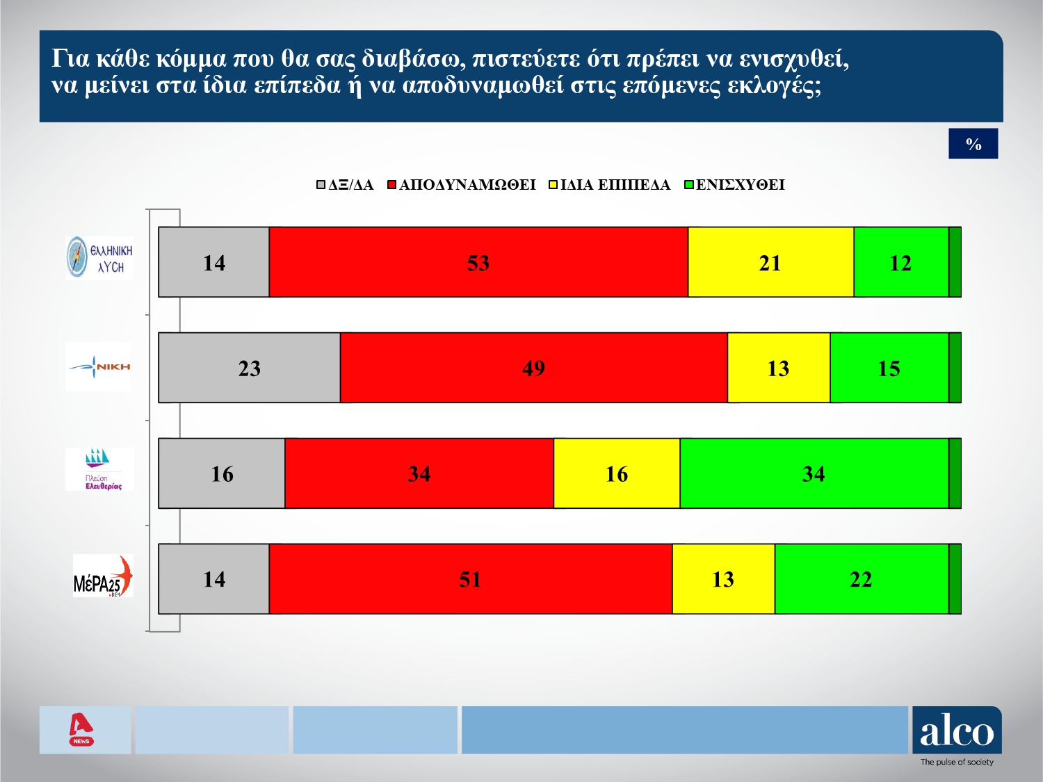 Σύμφωνα με τα αποτελέσματα της έρευνας της εταιρείας Alco για λογαριασμό του ALPHA, στην πρόθεση ψήφου επί των εγκύρων η Νέα Δημοκρατία προηγείται με 39,9% έναντι 18,2% του ΣΥΡΙΖΑ. Ακολουθούν το ΠΑΣΟΚ με 10,8%, το ΚΚΕ με 6,1%, η Πλεύση Ελευθερίας με 4,4%, η Νίκη με 3,4%, η Ελληνική Λύση με 3,3%, ενώ το ΜέΡΑ25 λαμβάνει 1,7%.