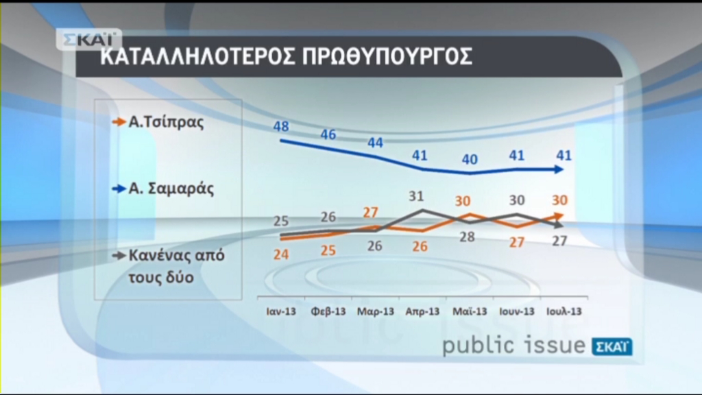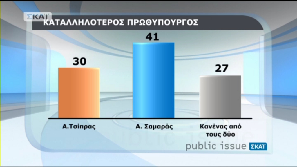 Καταλληλότερος πρωθυπουργός θεωρείται ο Αντώνης Σαμαράς με ποσοστό 41%, έναντι του Αλέξη Τσίπρα που συγκεντρώνει 30%.