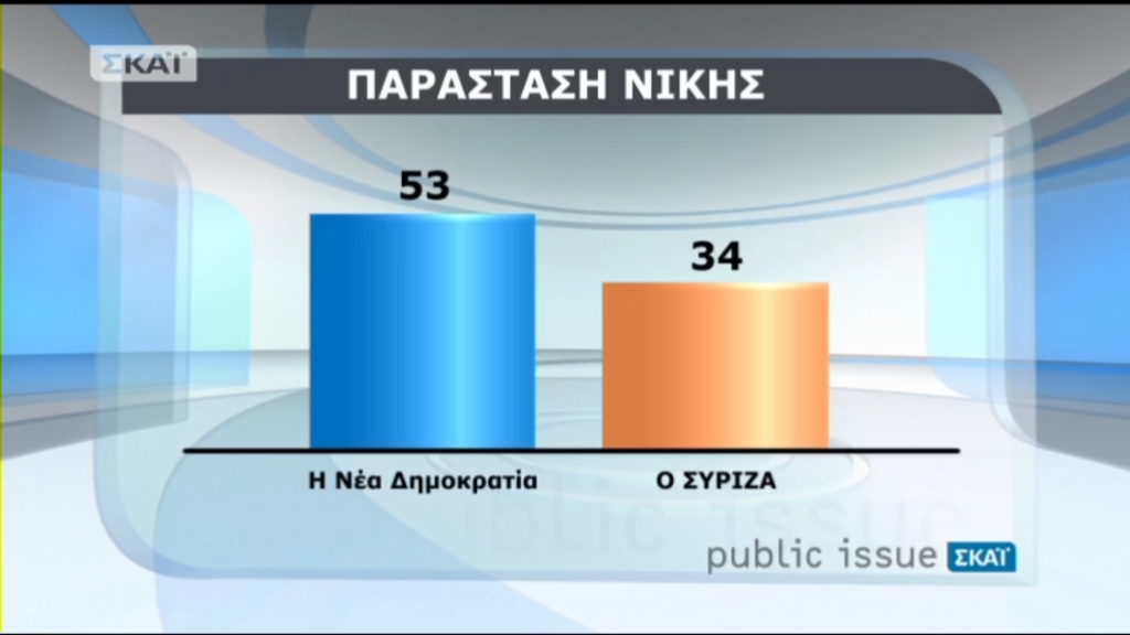 Στην παράσταση νίκης η ΝΔ φτάνει το 53%, ενώ ο ΣΥΡΙΖΑ συγκεντρώνει 34%.