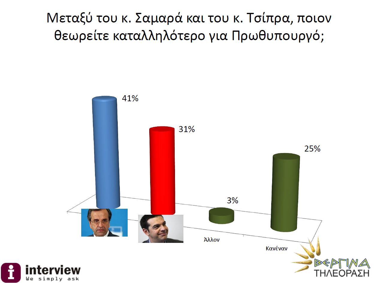 Την ίδια στιγμή, το 41% θεωρεί καταλληλότερο για πρωθυπουργό τον Αντώνη Σαμαρά ενώ το 31% τον Αλέξη Τσίπρα.