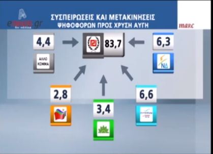 Τρίτο κόμμα στην πρόθεση ψήφου αναδεικνύεται η Χρυσή Αυγή με 9,6% . Ακολουθεί το ΠΑΣΟΚ με 6%, οι Ανεξάρτητοι Έλληνες με 5,5%, η ΔΗΜΑΡ με 4,9%, το ΚΚΕ με 4,8% ενώ