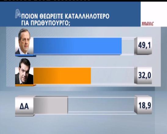 Πρώτος έρχεται ο ΣΥΡΙΖΑ και την παράσταση νίκης με 48,7% έναντι της ΝΔ με 34,8%. Την ίδια στιγμή, καταλληλότερος πρωθυπουργός εμφανίζεται ο Αντώνης Σαμαράς με ποσοστό 49,1%, ενώ ο Αλέξης Τσίπρας είναι δεύτερος με 32%.