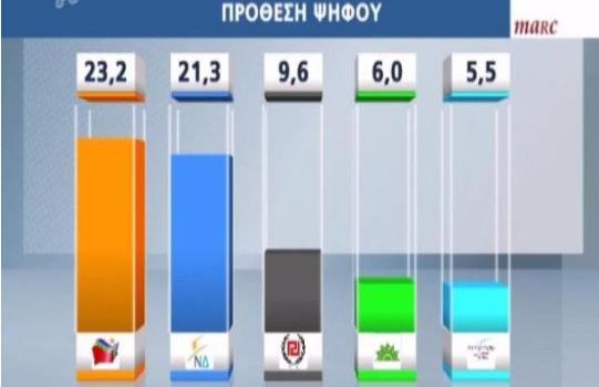 Προβάδισμα 23,2% του ΣΥΡΙΖΑ έναντι 21,3 % της Νέας Δημοκρατίας δείχνει νέα δημοσκόπηση που διεξήγαγε η Marc για λογαριασμό του ALPHA. Η δημοσκόπηση παρουσιάστηκε στην εκπομπή ALPHA Δημοσκόπηση της Κάτια Μακρή.