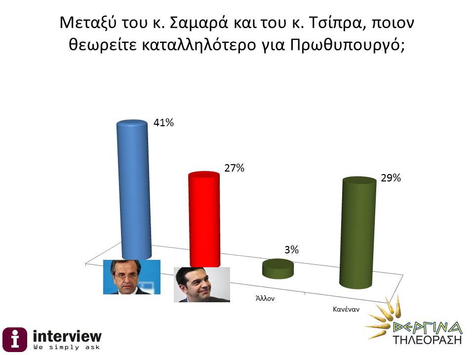 Ο κ. Σαμαράς θεωρείται καταλληλότερος για Πρωθυπουργός από το 41% των ερωτηθέντων, σε αντίθεση με τον κ. Τσιπρα που θεωρείται καταλληλότερος από το 27%.