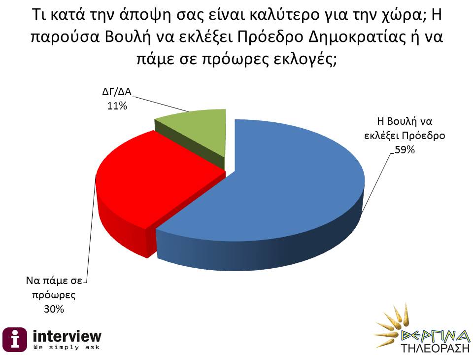 Την ίδια ώρα οι πολίτες εξακολουθούν να μη θέλουν εκλογές. Το 59% έχει την άποψη να εκλεγεί πρόεδρος της Δημοκρατίας από την παρούσα βουλή και το 30% επιθυμεί τη διεξαγωγεί πρόωρων εκλογών.