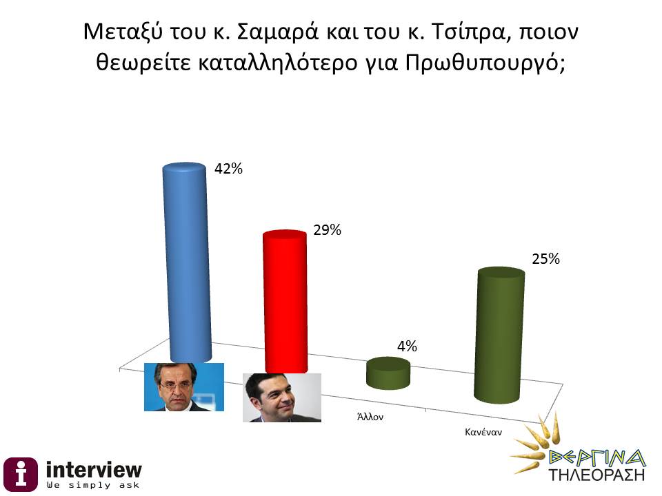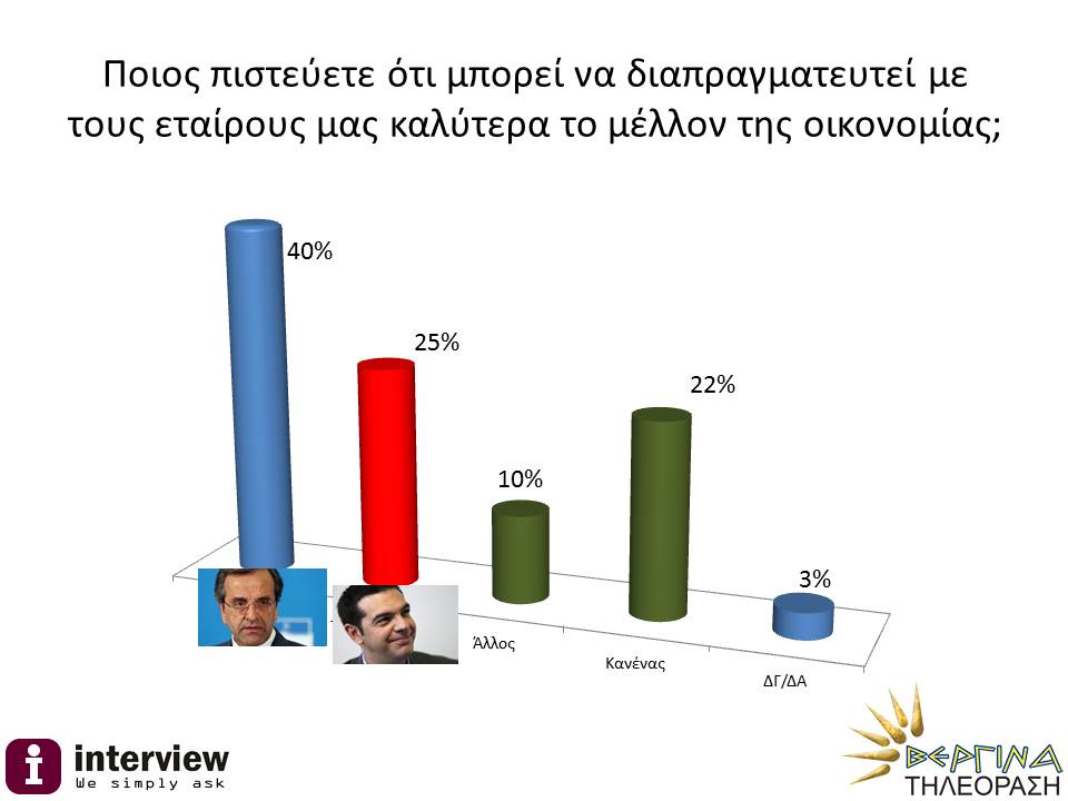 Στο ερώτημα, ποιον θεωρείται καταλληλότερο πρωθυπουργό για διαπραγματευτεί με τους εταίρους το μέλλον της ελληνικής οικονομίας, το 40% πιστεύει ότι καταλληλότερος είναι ο Αντώνης Σαμαράς και το 25% ο Αλέξης Τσίπρας. Αντίστοιχα, ο Αντώνης Σαμαράς παραμένει καταλληλότερος για πρωθυπουργός, με ποσοστό 42% ,έναντι του κ Τσίπρα, που συγκεντρώνει το 29 % των προτιμήσεων.