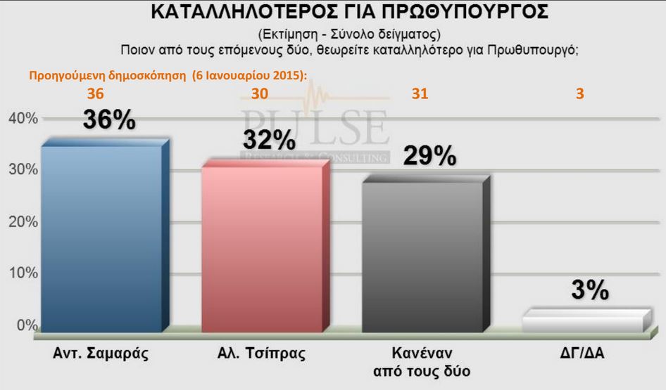 Στην παράσταση νίκης ο ΣΥΡΙΖΑ προηγείται με 63%. Επίσης, το 36% των ερωτηθέντων θεωρεί καταλληλότερο πρωθυπουργό τον Αντώνη Σαμαρά, ενώ 32% τον Αλέξη Τσίπρα.