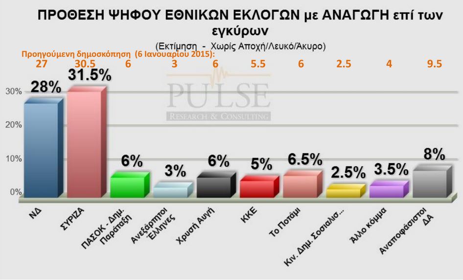 Στην πρόθεση ψήφου με αναγωγή επί των εγκύρων, προηγείται ο ΣΥΡΙΖΑ με 31,5%, ακολουθεί η ΝΔ με 28% , το Ποτάμι με 6,5%, το ΠΑΣΟΚ με 6%, η ΧΑ με 6%,το ΚΚΕ με 5%, οι ΑΝΕΛ με 3%, και το Κίνημα Δημοκρατών Σοσιαλιστών με 2,5%.