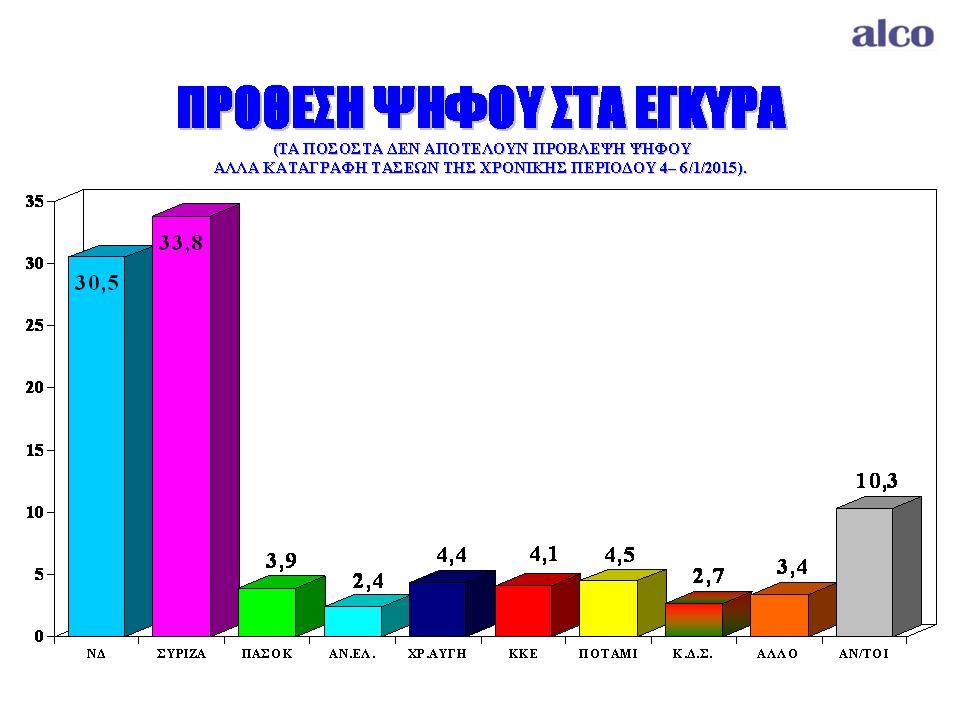 Προβάδισμα 3% του ΣΥΡΙΖΑ έναντι της ΝΔ καταγράφεται στη δημοσκόπηση της εταιρείας ALCO για την εφημερίδα «Το Ποντίκι» που κυκλοφορεί την Πέμπτη.