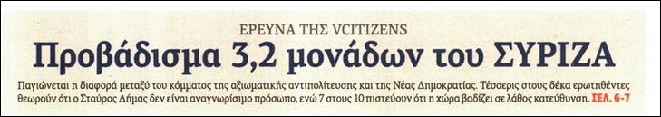 Προβάδισμα του ΣΥΡΙΖΑ με 3,2% έναντι της ΝΔ στην «πιθανότητα ψήφου για τις εκλογές» δείχνει έρευνα που πραγματοποίησε η εταιρεία VCITIZENS για λογαριασμό δυο ιδιωτικών χρηματοοικονομικών οργανισμών και δημοσιεύει σήμερα η «Εφημερίδα των Συντακτών».