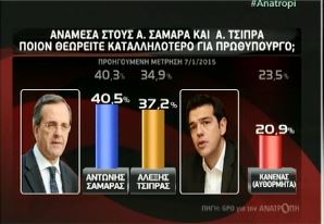Στην ερώτηση περί καταλληλότερου πρωθυπουργού, προηγείται ο Αντώνης Σαμαράς με 40,5% και ακολουθεί ο Αλέξης Τσίπρας με 37,2%. Κανένας απάντησε (αυθόρμητα) το 20,9%.