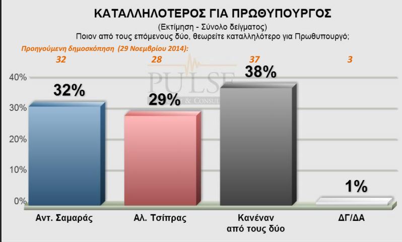 Στην καταλληλότητα για την πρωθυπουργία προηγείται ο Αντώνης Σαμαράς με 32% έναντι 29% του Αλέξη Τσίπρα, ενώ στην παράσταση νίκης το 63% πιστεύει ότι θα κερδίσει τις εκλογές ο ΣΥΡΙΖΑ, έναντι 24% που θεωρεί ότι θα κερδίσει η ΝΔ.