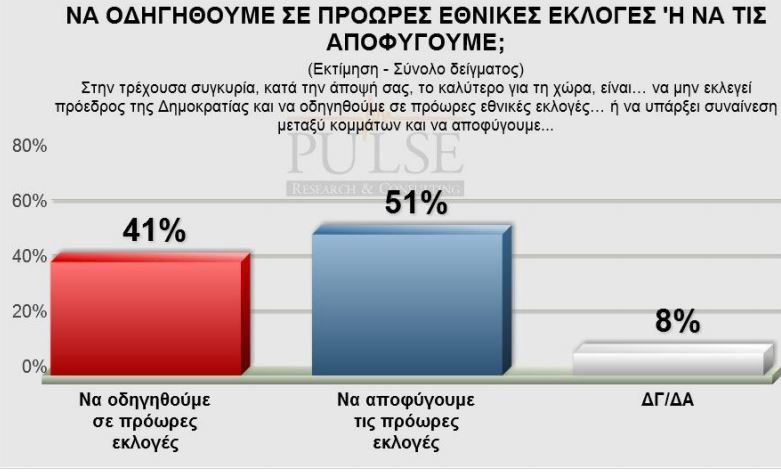 Τέλος, όχι σε πρόωρες εκλογές λέει το 51% των ερωτηθέντων, σε αντίθεση με το 41% που επιθυμεί να οδηγηθούμε σε πρόωρες εκλογές.