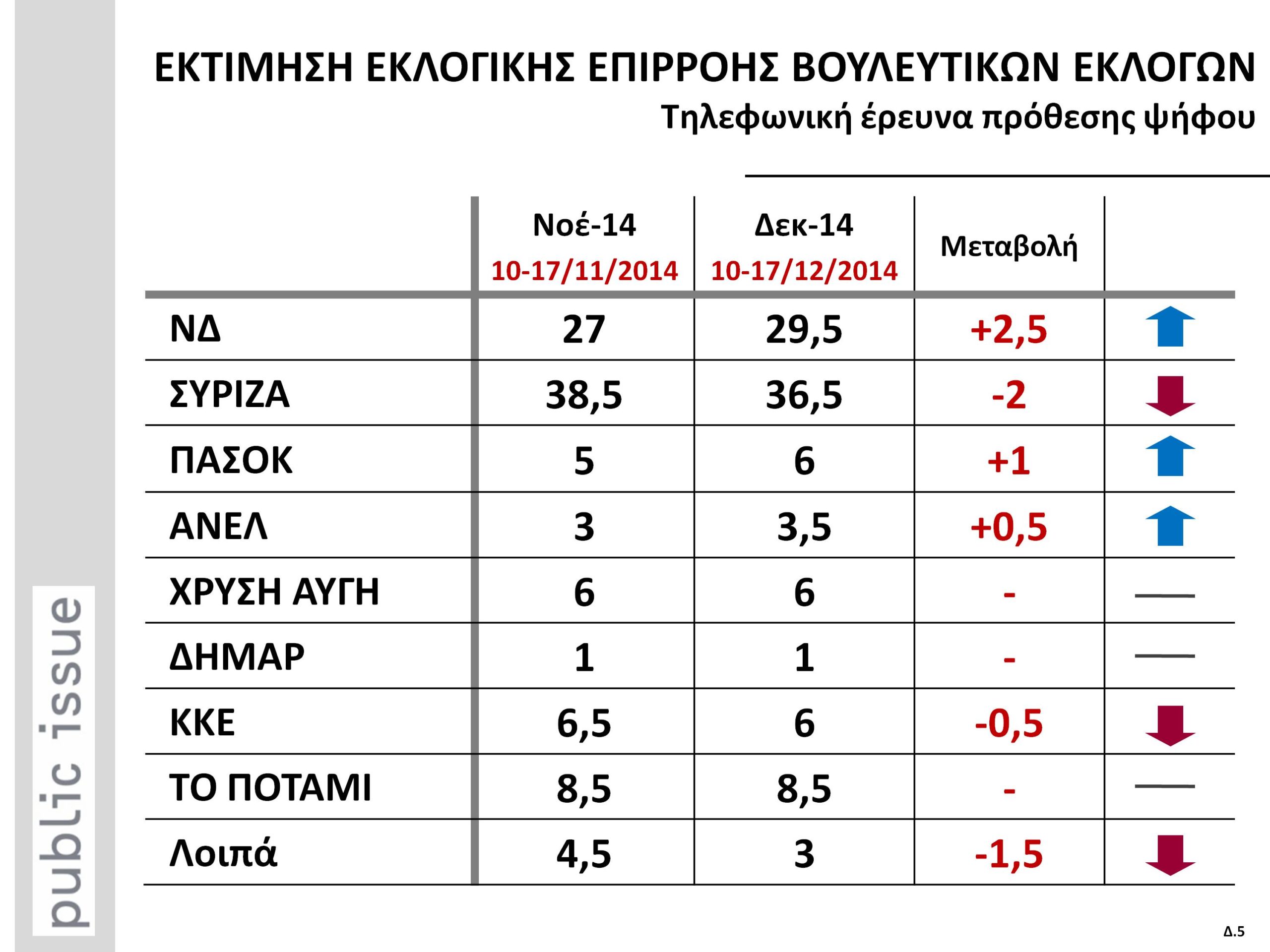 Συγκεκριμένα, στην εκτίμηση εκλογικής επιρροής ο ΣΥΡΙΖΑ συγκεντρώνει 36,5% (38,5% τον Νοέμβριο) και η ΝΔ 29,5% (27%). Στην τρίτη θέση βρίσκεται «Το Ποτάμι» με 8,5% (8,5%).