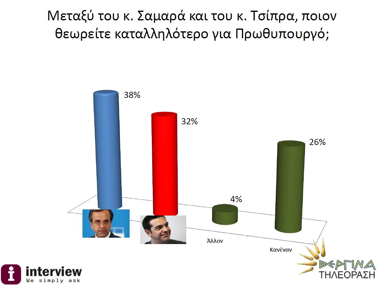 Καταλληλότερος για πρωθυπουργός παραμένει ο Αντώνης Σαμαράς με ποσοστό 38% έναντι του Αλέξη Τσίπρα που συγκεντρώνει το 32% των προτιμήσεων.