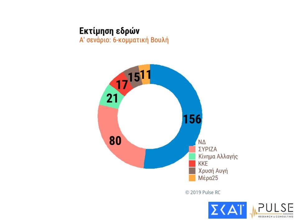 Στις οκτώ μονάδες είναι η διαφορά ανάμεσα σε ΝΔ και ΣΥΡΙΖΑ σύμφωνα με δημοσκόπηση της Pulse που διενεργήθηκε για λογαριασμό του ΣΚΑΪ.Στη δημοσκόπηση που παρουσιάζεται σχεδόν τρεις εβδομάδες πριν τις εκλογές της 7ης Ιουλίου, στην ερώτηση «αν είχαμε εκλογές την ερχόμενη Κυριακή τι θα ψηφίζατε;». To 33,5% απαντά Νέα Δημοκρατία και το 25,5% ΣΥΡΙΖΑ. Στην τρίτη θέση βρίσκεται το Κίνημα Αλλαγής με 6,5%, πολύ κάτω από το 7,8% των ευρωεκλογών ενώ τέταρτο είναι το ΚΚΕ με 5,5% που βρίσκεται μπροστά από τη Χρυσή Αυγή που έχει 5%.Στην πρόθεση ψήφου με αναγωγή η Νέα Δημοκρατία συγκεντρώνει 34,5%, ο ΣΥΡΙΖΑ 26%, το ΚΙΝΑΛ 7, το ΚΚΕ 5,5%, η Χρυσή Αυγή 5%, το ΜέΡΑ 25 3,5%, και η Ελληνική Λύση 3%. Στο 5% είναι το «άλλο» και στο 8,5% είναι οι αναποφάσιστοι.Στην παράσταση νίκης το 70% προβλέπει επικράτηση της ΝΔ έναντι 19% που προβλέπει επικράτηση του ΣΥΡΙΖΑ με τη διαφορά να αυξάνεται στις 51 ποσοστιαίες μονάδες. Η συσπείρωση στον ΣΥΡΙΖΑ ανέρχεται στο 88% με τις διαρροές να αγγίζουν το 3% προς ΝΔ, το 2% προς ΚΙΝΑΛ ενώ ποσοστό 4% των διαρροών είναι αδιευκρίνιστο που κατευθύνεται. Συγκριτικά, η συσπείρωση στη ΝΔ φθάνει το 90%, με 3% να διαρρέει προς ΣΥΡΙΖΑ, 2% προς ΚΙΝΑΛ, ενώ ποσοστό 3% των διαρροών είναι αδιευκρίνιστο που κατευθύνεται.Στο ερώτημα για το ποιος είναι καταλληλότερος πρωθυπουργός το 36% απαντά ο Κυριάκος Μητσοτάκης και το 26% ο Αλέξης Τσίπρας. Το 32% θεωρεί ότι δεν είναι κανένας από τους δύο.Δείτε τους πίνακες: