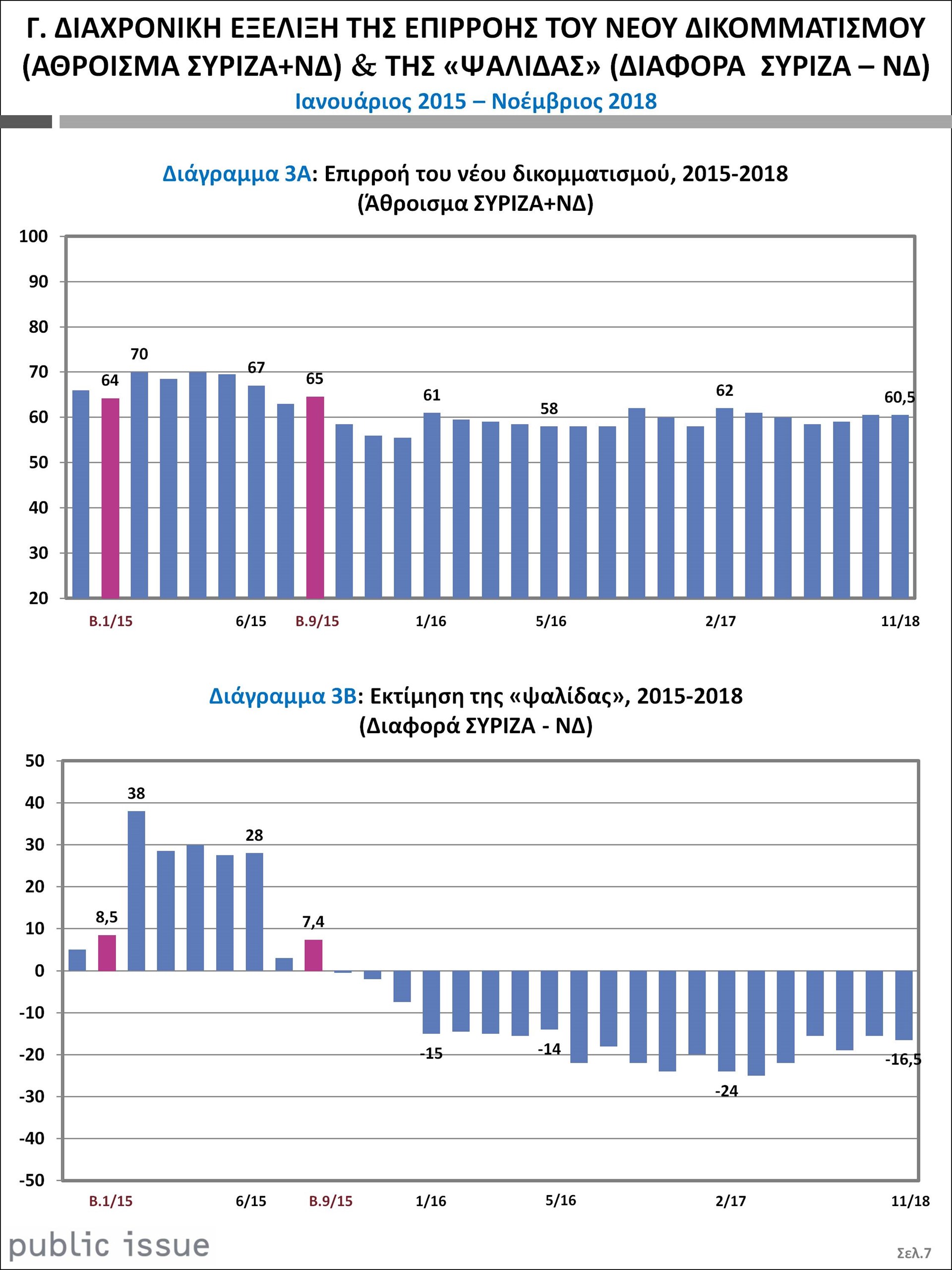 Σύμφωνα με τους αναλυτές της Public Issue, οι τάσεις του εκλογικού σώματος εμφανίζονται παγιωμένες, από τις αρχές του 2018. Κανένα από τα μείζονα συμβάντα του τρέχοντος έτους (συμφωνία των Πρεσπών, κυβερνητική καμπάνια σχετικά με την ολοκλήρωση του ελληνικού μνημονιακού προγράμματος, φονικές πυρκαγιές της Αττικής, διώξεις παλιών αξιωματούχων για διαφθορά, διαφαινόμενη μη-περικοπή των συντάξεων, συμφωνία Αρχιεπισκόπου-Πρωθυπουργού για τον χωρισμό κράτους-Εκκλησίας, κλπ.) δεν φαίνεται να έχουν ασκήσει ιδιαίτερη επίδραση στην πολιτική σκηνή, τουλάχιστον η συνισταμένη τους.