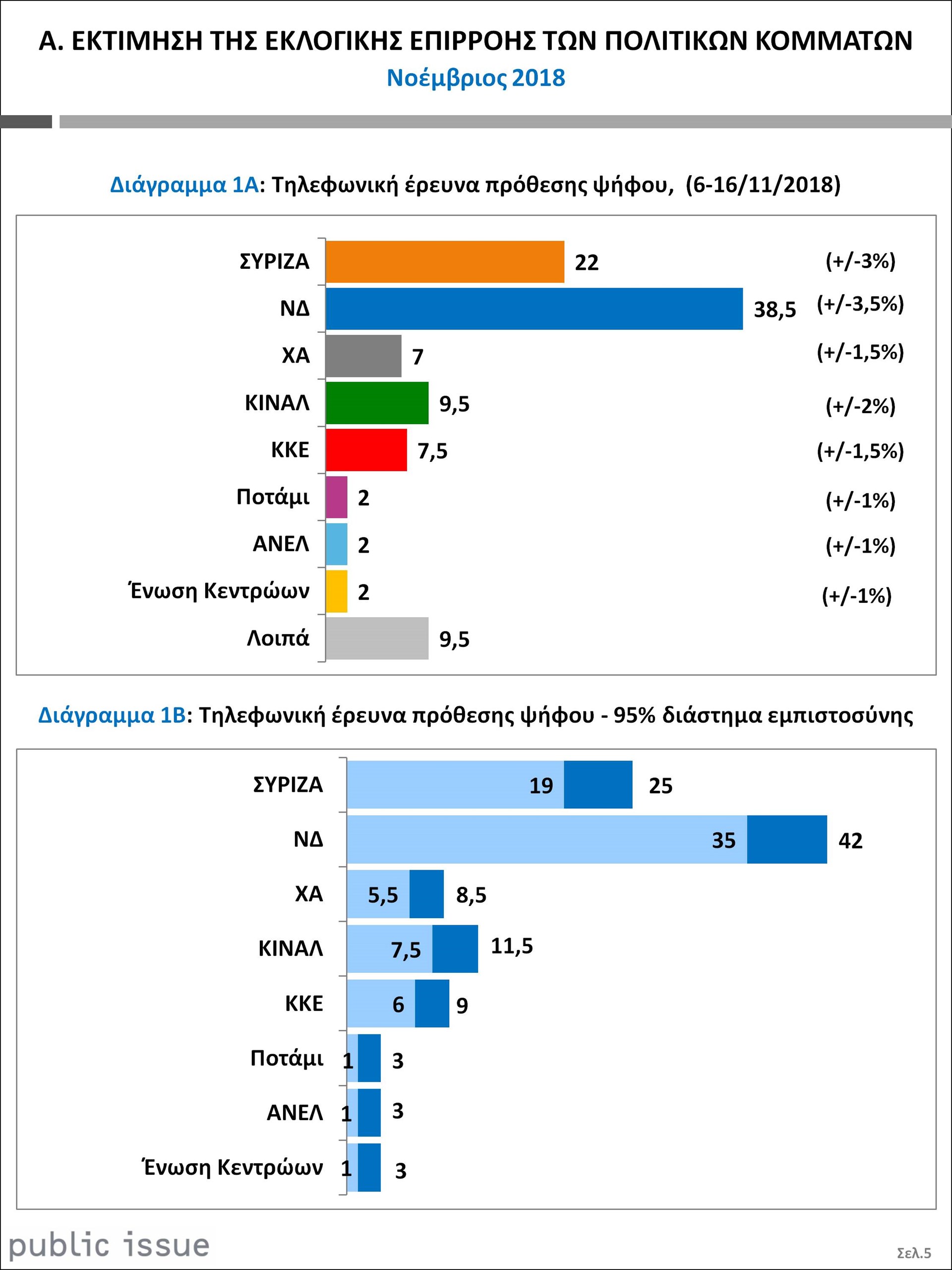 Συγκεκριμένα, στην πρόθεση ψήφου η Νέα Δημοκρατία συγκεντρώνει ποσοστό 38,5% έναντι 22% του ΣΥΡΙΖΑ. Στην τρίτη θέση βρίσκεται το Κίνημα Αλλαγής με 9,5% και ακολουθούν ΚΚΕ με 7,5%, Χρυσή Αυγή με 7%. Ποτάμι, ΑΝΕΛ και Ένωση Κεντρώων συγκεντρώνουν από 2%. Το ποσοστό των υπόλοιπων κομμάτων φτάνει το 9,5%.