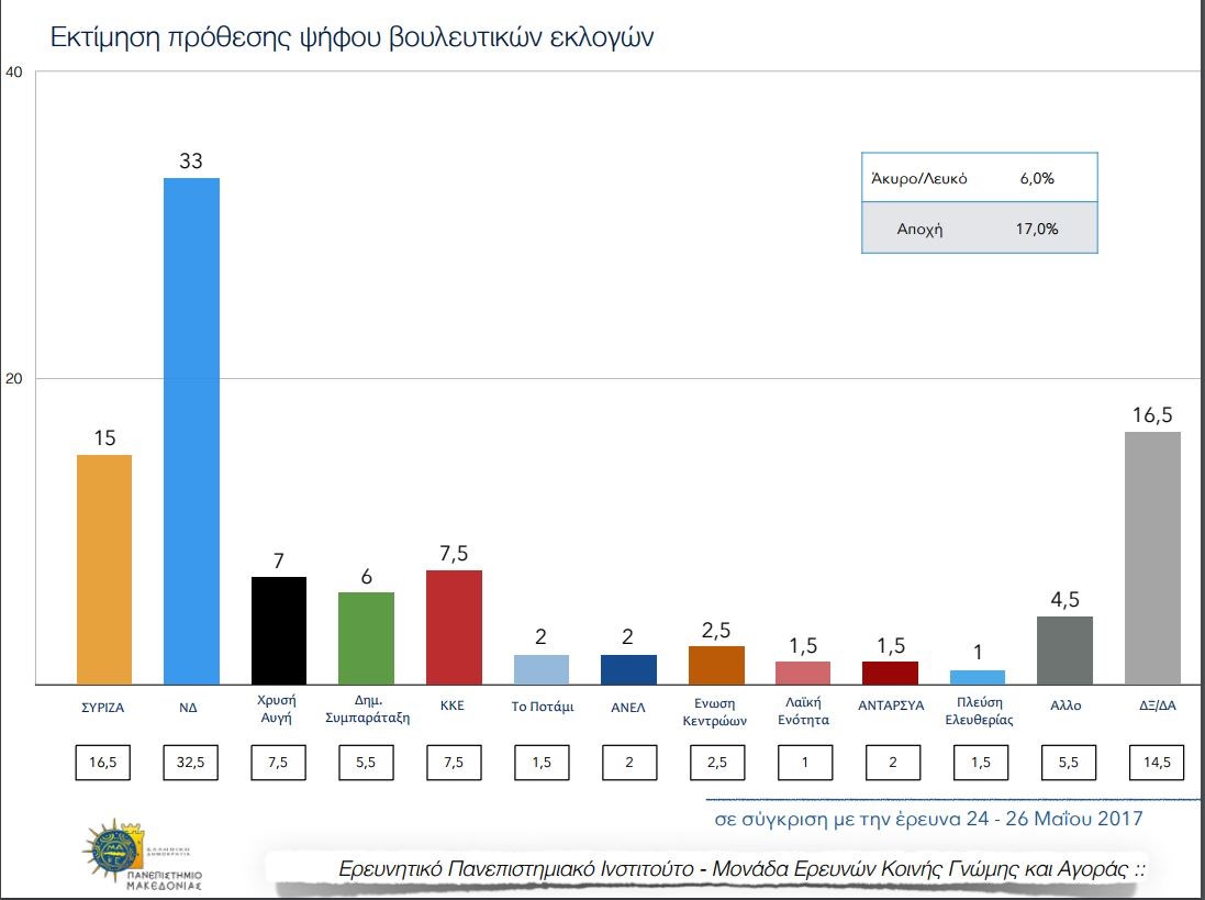 Συγκεκριμένα, σύμφωνα με τη δημοσκόπηση, στην εκτίμηση πρόθεσης ψήφου, η Νέα Δημοκρατία συγκεντρώνει ποσοστό 33% παρουσιάζοντας άνοδο 0,5% συγκριτικά με την προηγούμενη δημοσκόπηση του ΠΑΜΑΚ, ενώ ο ΣΥΡΙΖΑ εμφανίζει πτώση 1,5% περνώντας στο 15% από 16,5%. Τρίτο κόμμα, σύμφωνα με τη δημοσκόπηση είναι το ΚΚΕ το οποίο διατηρεί το ποσοστό του στο 7,5%. Η Χρυσή Αυγή συγκεντρώνει 7% (από 7,5%) και η Δημοκρατική Συμπαράταξη 6% (από 5,5%).