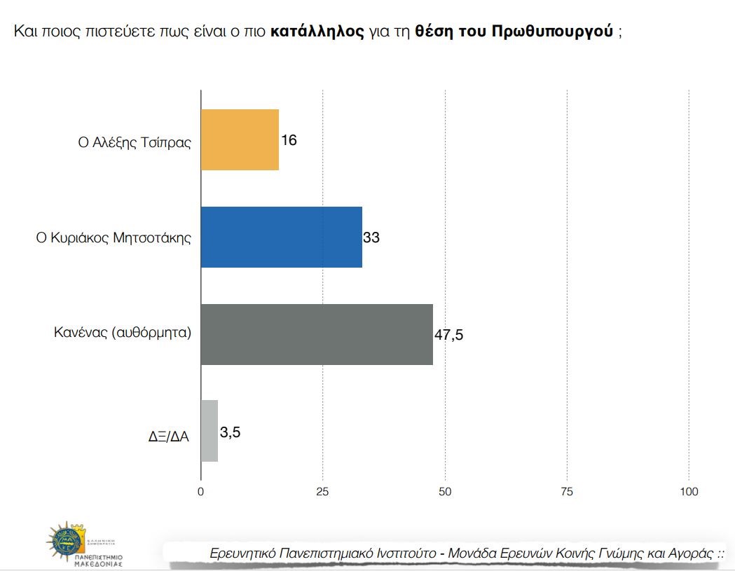 Καταλληλότερος Πρωθυπουργός θεωρείται με 33% ο Κυριάκος Μητσοτάκης, ενώ το 16% δηλώνει ότι πιο κατάλληλος είναι ο Αλέξης Τσίπρας. Ωστόσο, είναι χαρακτηριστικό ότι το 47,5% των ερωτηθέντων απαντά “κανένας”.