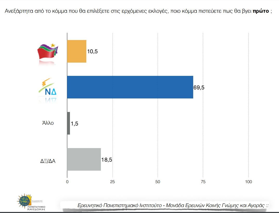 Στην παράσταση νίκης η ΝΔ συγκεντρώνει 69,5% έναντι 10,5% του ΣΥΡΙΖΑ. Άλλο κόμμα προκρίνει το 1,5% των ερωτώμενων ενώ το 18,5% δηλώνει δεν ξέρω/ δεν απαντώ.