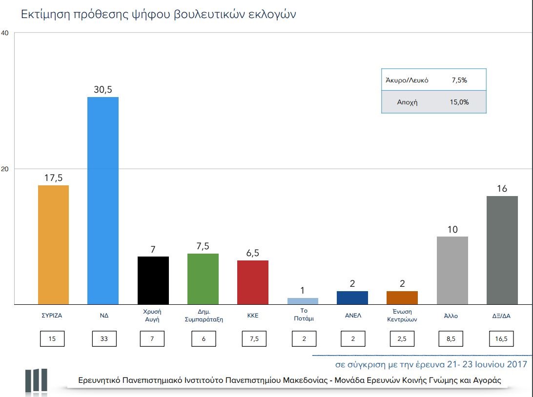 Προβάδισμα 13 ποσοστιαίων μονάδων της ΝΔ έναντι του ΣΥΡΙΖΑ καταγράφεται στη νέα δημοσκόπηση του Πανεπιστήμιου Μακεδονίας που παρουσίασε ο ΣΚΑΪ.