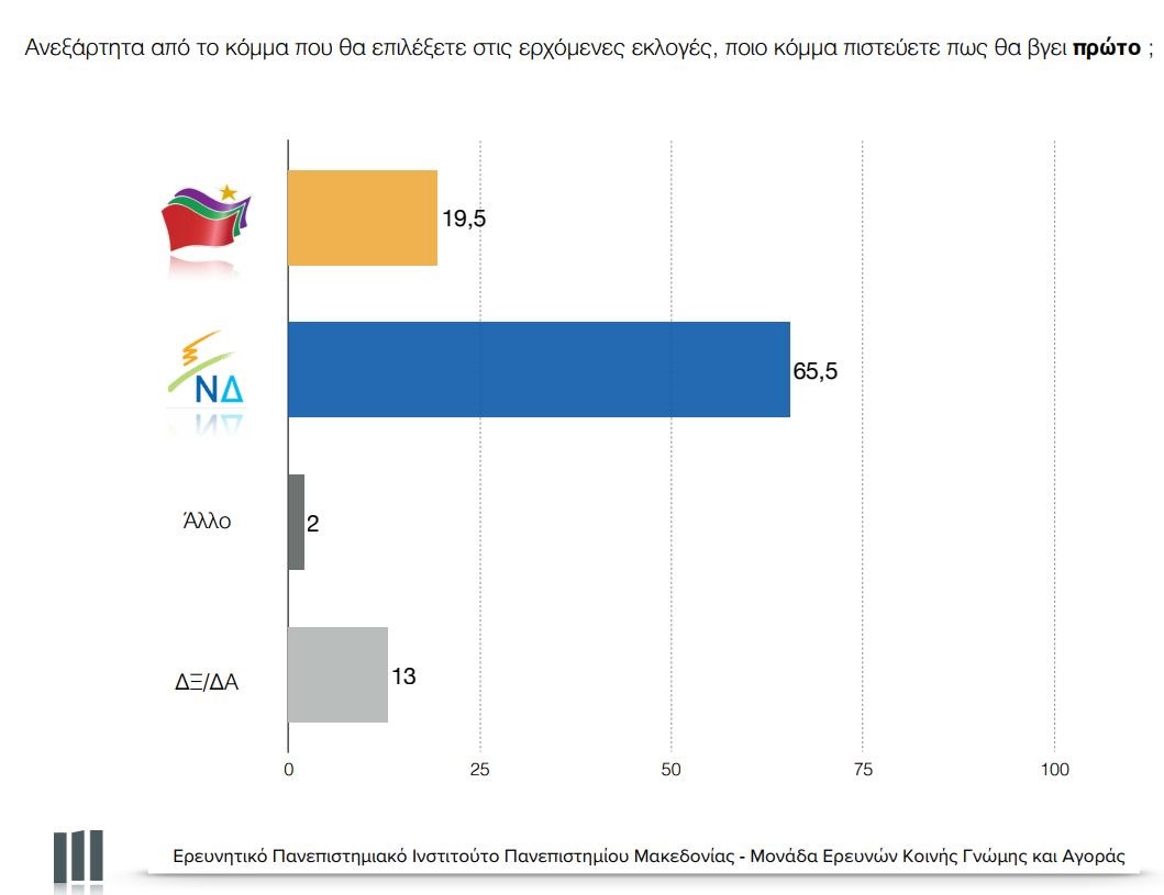 Στην παράσταση νίκης η ΝΔ προηγείται του ΣΥΡΙΖΑ με 65,5% έναντι 19,5%, 2% εκτιμά ότι θα κερδίσει τις εκλογές άλλο κόμμα, ενώ 13% δηλώνουν δεν ξέρω/ δεν απαντώ.