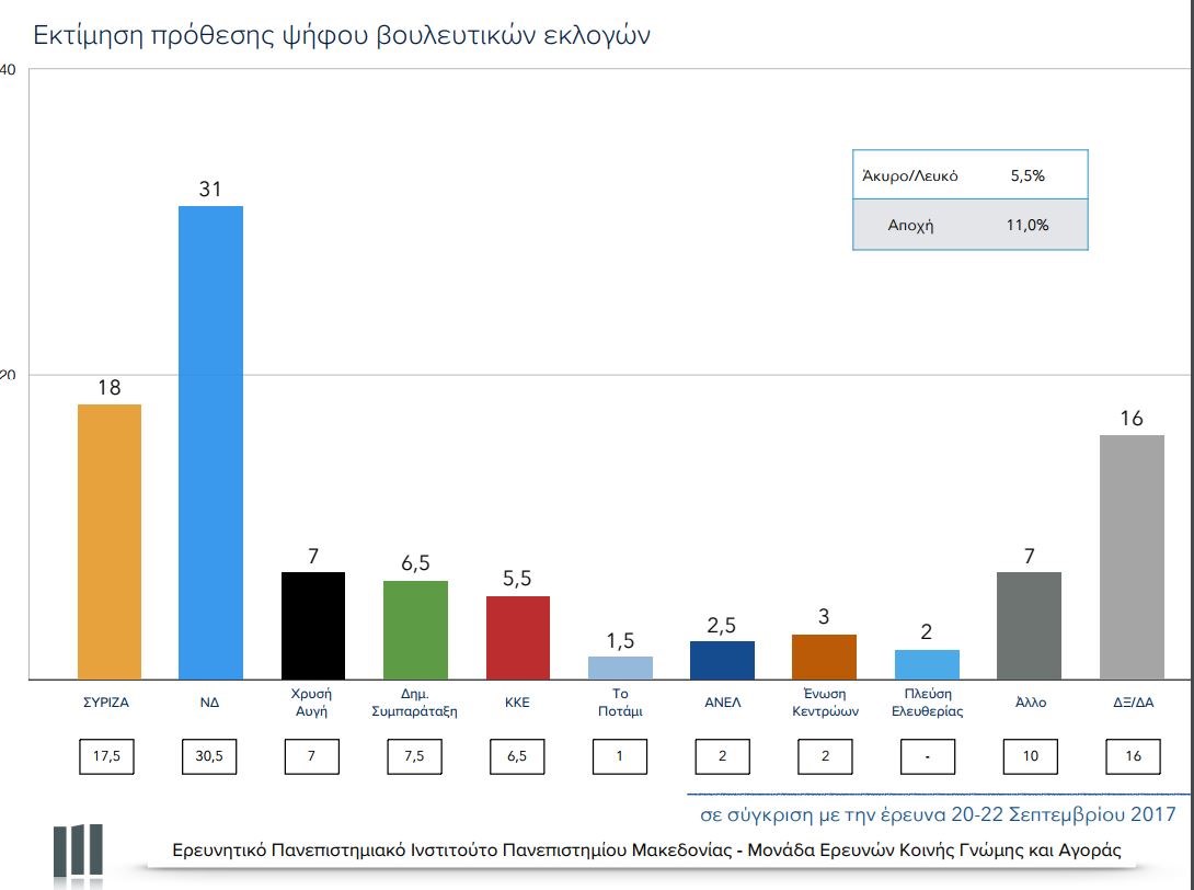 Συγκεκριμένα, στην πρόθεση ψήφου η ΝΔ συγκεντρώνει 31% έναντι 30,5% στη σφυγμομέτρηση του Σεπτεμβρίου, ο ΣΥΡΙΖΑ σημειώνει 18% έναντι 17,5%, η Χρυσή Αυγή παραμένει σταθερή στο 7%, η Δημοκρατική συμπαράταξη καταγράφει 6,5% έναντι 7,5%, το ΚΚΕ 5,5% έναντι 6,5%, Το Ποτάμι 1,5% έναντι 1%, οι ΑΝΕΛ 2,5% έναντι 2% η Ένωση Κεντρώων 3% έναντι 2%, η Πλεύση Ελευθερίας 2% (χωρίς ποσοστό στο προηγούμενο γκάλοπ). “Άλλο κόμμα” δηλώνει ότι θα ψηφίσει το 7% των ερωτηθέντων, το 16% δηλώνει δεν ξέρω/ δεν απαντώ, άκυρο/ λευκό θα ψήφιζε το 5,5% ενώ 11% θα απείχε από την εκλογική αναμέτρηση.