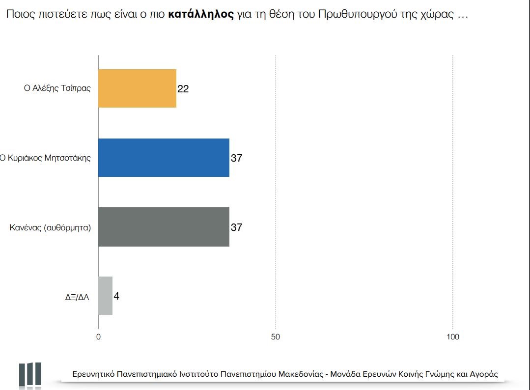 Επίσης, το 37% εκτιμά ότι καταλληλότερος για τη θέση του πρωθυπουργού είναι ο Κυριάκος Μητσοτάκης ενώ το 22% ο Αλέξης Τσίπρας. “Κανένας” απαντά το 37% των ερωτώμενων ενώ 4% δηλώνει δεν ξέρω/ δεν απαντώ.