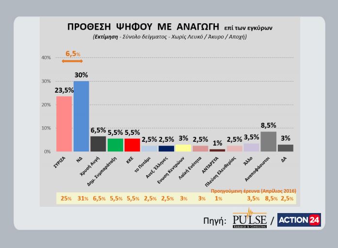 Προβάδισμα της ΝΔ έναντι του ΣΥΡΙΖΑ με διαφορά 6% στην πρόθεση ψήφου καταγράφει δημοσκόπηση της εταιρείας Pulse για την εκπομπή EveningReport του Action 24.