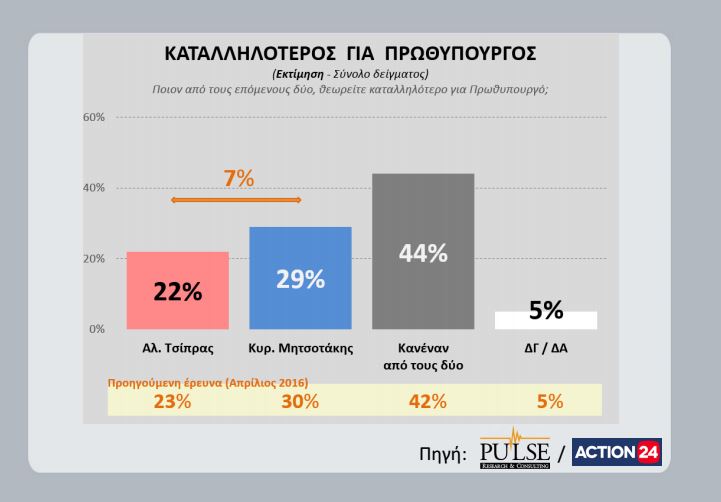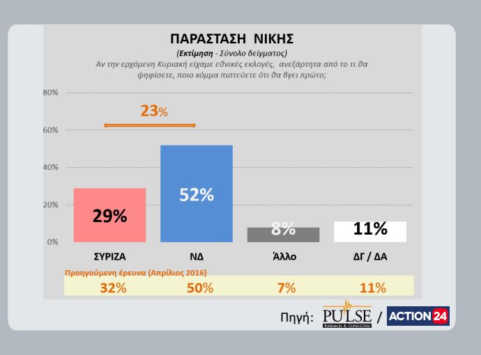 Η ΝΔ καταγράφει παράσταση νίκης 52% έναντι 29% του ΣΥΡΙΖΑ, ενώ στην καταλληλότητα για την πρωθυπουργία ο Κυριάκος Μητσοτάκης προηγείται με 29% έναντι 22% του Αλέξη Τσίπρα.