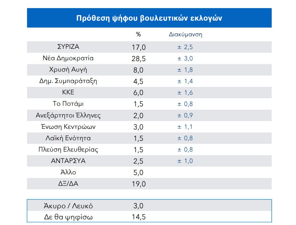 Συγκεκριμένα, σύμφωνα με τα ευρήματα της δημοσκόπησης που παρουσιάστηκαν στο κεντρικό δελτίο του ΣΚΑΪ, στην πρόθεση ψήφου η ΝΔ σημειώνει 28,5%, ο ΣΥΡΙΖΑ 17%, η ΧΑ είναι τρίτο κόμμα με 8%, 6% λαμβάνει το ΚΚΕ, 4,5% η Δημοκρατική Συμπαράταξη, 3% η Ένωση Κεντρώων, 2,5% η ΑΝΤΑΡΣΥΑ, 2% οι ΑΝΕΛ, από 1,5% καταγράφουν Το Ποτάμι, η ΛΑΕ και η Πλεύση Ελευθερίας, 5% άλλα κόμματα, ενώ 19% απαντά ΔΞ/ΔΑ.