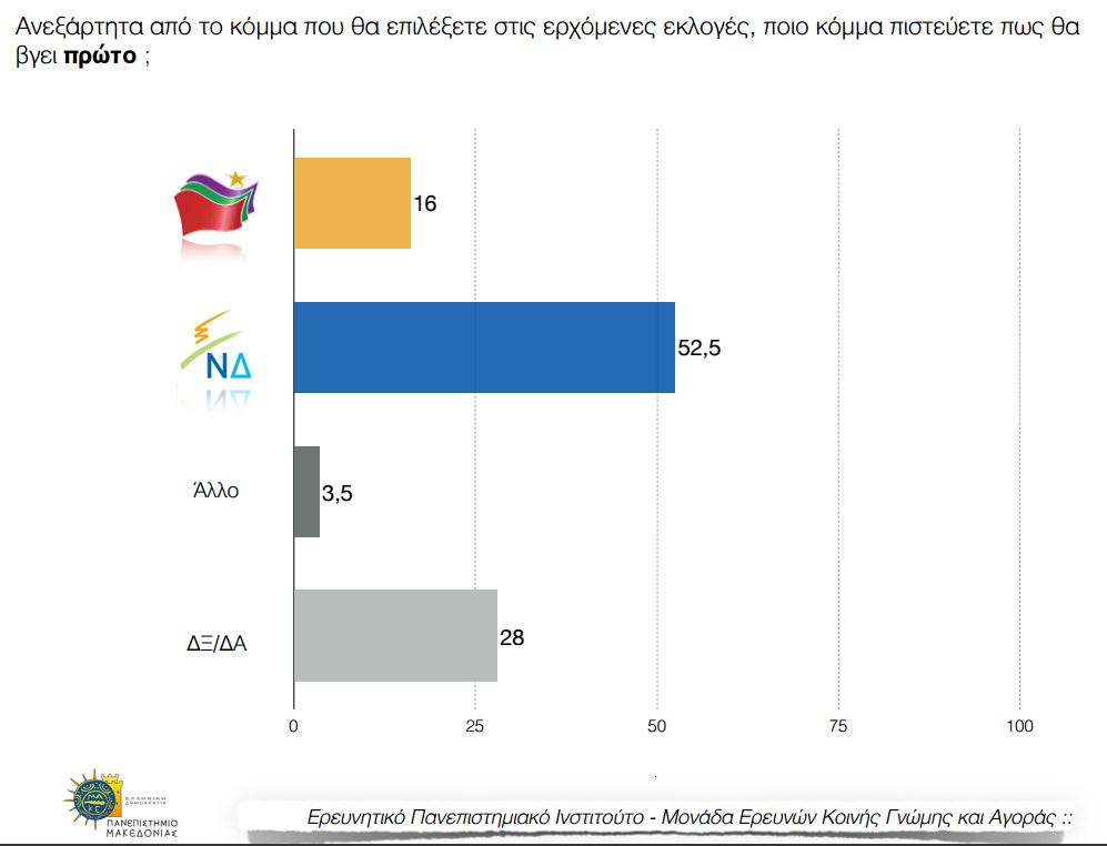 Προβάδισμα 11,5% στην πρόθεση ψήφου καταγράφει η ΝΔ έναντι του ΣΥΡΙΖΑ στη δημοσκόπηση του Πανεπιστημίου Μακεδονίας για λογαριασμό του ΣΚΑΪ, ενώ στην παράσταση νίκης η διαφορά υπέρ της ΝΔ φτάνει τις 36,5 ποσοστιαίες μονάδες (52,5% έναντι 16%).