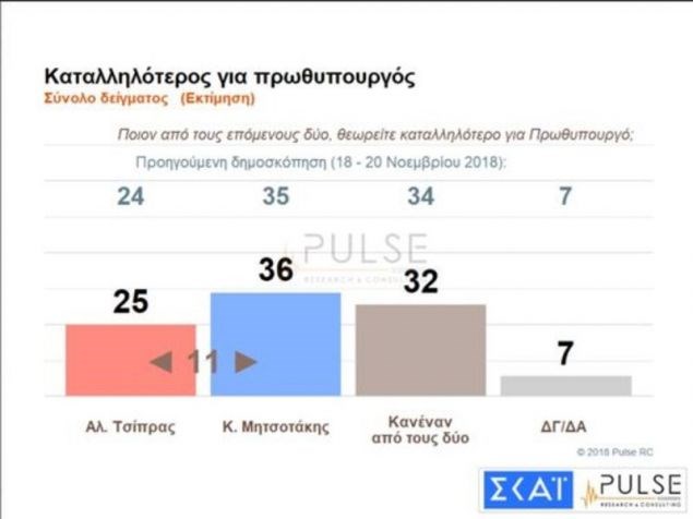 Στο μέτωπο της καταλληλότητας για την πρωθυπουργία ο Κυριάκος Μητσοτάκης διατηρεί αμετάβλητο προβάδισμα 11 μονάδων σε βάρος του Αλέξη Τσίπρα με αμφότερους τους αρχηγούς να βελτιώνουν την στήριξή τους κατά μία μονάδα έκαστος.