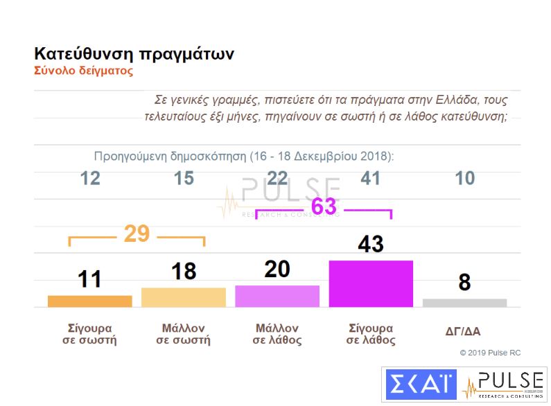 Οι Έλληνες εμφανίζονται απαισιόδοξοι για την κατεύθυνση που πηγαίνουν τα πράγματα στην χώρα. Στην ερώτηση σε τι κατεύθυνση πηγαίνουν τα πράγματα στην Ελλάδα τους τελευταίους έξι μήνες το 63% απαντά Σίγουρα/Μάλλον σε λάθος κατεύθυνση. Μόλις το 29% απαντά σε Σίγουρα/Μάλλον σωστή κατεύθυνση.