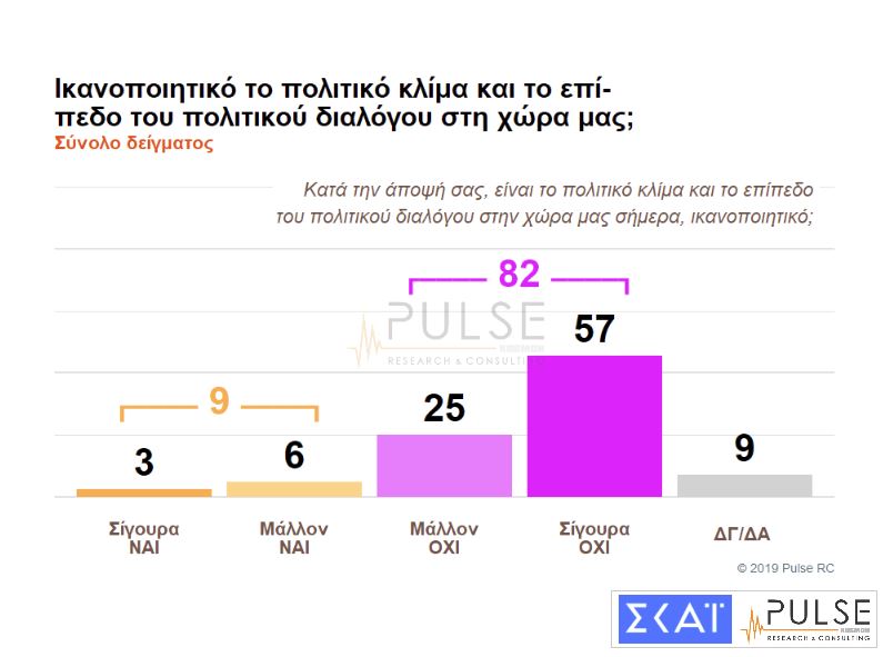 Παράλληλα οι πολίτες δηλώνουν δυσαρεστημένοι με το πολιτικό κλίμα και το επίπεδο πολιτικού διαλόγου στη χώρα. Το 82% απαντά ότι το πολιτικό κλίμα είναι Σίγουρα/Μάλλον όχι ικανοποιητικό και μόλις το 9% απαντά Σίγουρα/Μάλλον ναι.