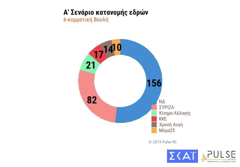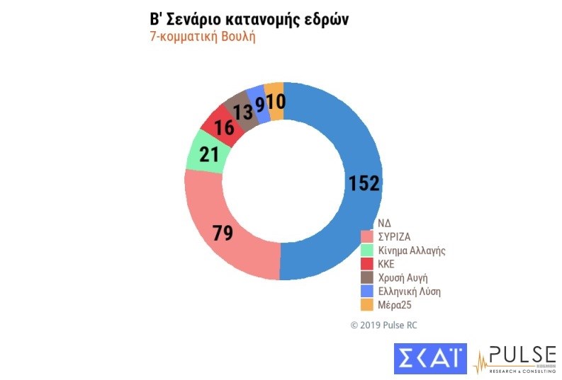Σε περίπτωση που η Ελληνική Λύση δεν καταφέρει να μπει στην Βουλή η δημοσκόπηση υπολογίζει πως η ΝΔ θα αποσπάσει 156 έδρες, έχοντας καθαρή αυτοδυναμία. Εάν το κόμμα Βελόπουλου εξασφαλίσει θέση στην νέα Βουλή η πλειοψηφία της ΝΔ περιορίζεται στις 152 έδρες.
