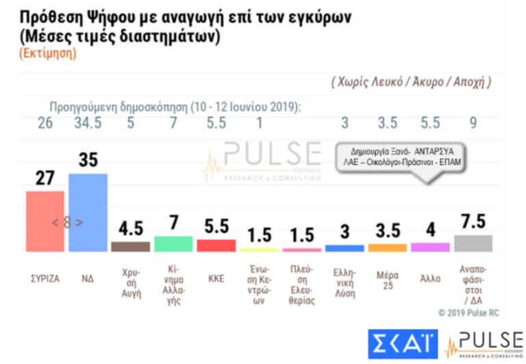 Η Νέα Δημοκρατία προηγείται στην πρόθεση ψήφου του ΣΥΡΙΖΑ σύμφωνα με τη νέα δημοσκόπηση της Pulse για λογαριασμό του ΣΚΑΪ.Στην πρόθεση ψήφου με αναγωγή η ΝΔ προηγείται με 35% έναντι 27% του ΣΥΡΙΖΑ, ΚΙΝΑΛ στο 7%, ΚΚΕ 5,5%, Ένωση Κεντρώων 1,5%, Πλεύση Ελευθερίας 1,5%, Ελληνική Λύση 3% και ΜέΡΑ 25 με 3,5% και άλλο κόμμα 4%.