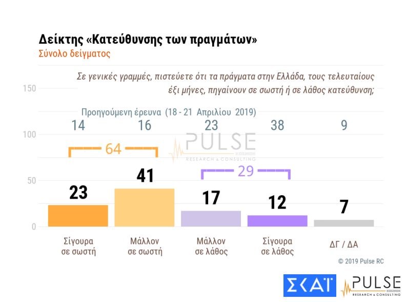 Σε ερώτηση “πιστεύετε ότι τα πράγματα στην Ελλάδα, τους τελευταίους έξι μήνες, πηγαίνουν σε σωστή ή σε λάθος κατεύθυνση;”, το 23% των ερωτηθέντων απάντησε “σίγουρα σε σωστή”, το 41% “μάλλον σε σωστή”, το 17% “μάλλον σε λάθος”, το 12% “σίγουρα σε λάθος” και το 7% απάντησε Δεν Γνωρίζω/Δεν Απαντώ.