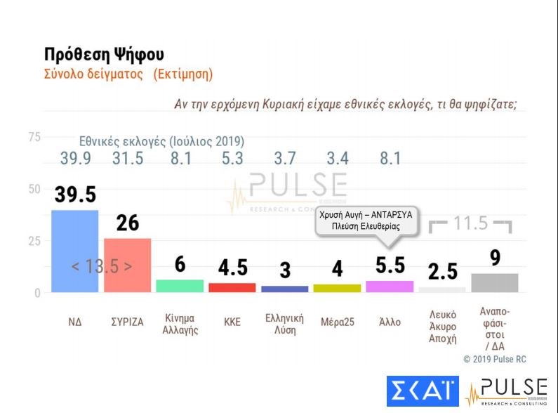 Σύμφωνα με τη δημοσκόπηση που διενήργησε η Pulse για λογαριασμό του ΣΚΑΪ, στην πρόθεση ψήφου η ΝΔ παίρνει ποσοστό 39,5% έναντι 26% του ΣΥΡΙΖΑ, με τη διαφορά μεταξύ τους να διαμορφώνεται στις 13,5 μονάδες. Ακολουθούν το ΚΙΝΑΛ με 6%, το ΚΚΕ με 4,5%, η Ελληνική Λύση με 3%, το ΜέΡΑ25 με 4%.