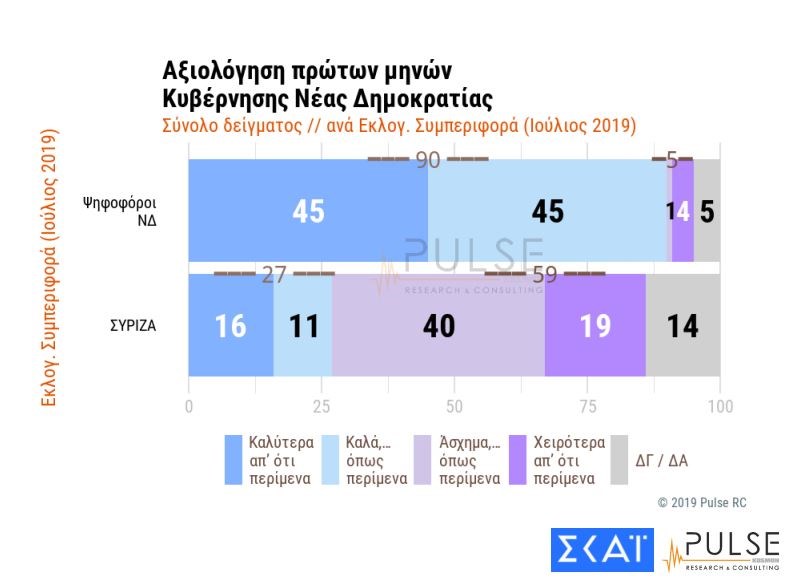 Στην ίδια ερώτηση, μεταξύ των ψηφοφόρων της ΝΔ, το 90% απαντά “καλύτερα απ’ ότι περίμενα” και “καλά… όπως περίμενα”. Σε ποσοστό 40% οι ερωτηθέντες που στην τελευταία εκλογική αναμέτρηση ψήφισαν ΣΥΡΙΖΑ, απάντησαν “άσχημα… όπως περίμενα”.