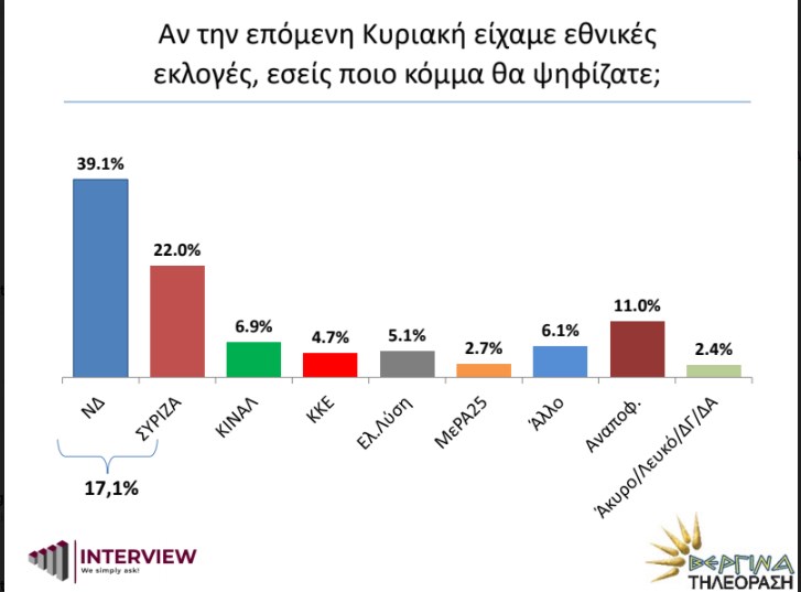 Διψήφια διαφορά από τον ΣΥΡΙΖΑ διατηρεί η ΝΔ σύμφωνα με δημοσκόπηση της Interview για λογαριασμό του «Βεργίνα TV». Συγκεκριμένα, στο ερώτημα «αν την επόμενη Κυριακή είχαμε εθνικές εκλογές, εσείς ποιο κόμμα θα επιλέγατε», το 39,1% απαντά ΝΔ έναντι 22% του ΣΥΡΙΖΑ. Στην 3η θέση των απαντήσεων βρίσκεται το ΚΙΝΑΛ με 6,9%, η Ελληνική Λύση είναι στο 5,1%, ακολουθεί το ΚΚΕ με 4,7%, ενώ το ΜέΡΑ25 είναι στο 2,7%. Το «άλλο κόμμα» βρίσκεται στο 6,1%, οι αναποφάσιστοι βρίσκονται στο 11%, ενώ το «άκυρο/λευκό/δεν γνωρίζω/δεν απαντώ» είναι στο 2,4%.