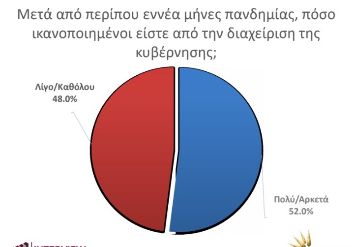 Ενδιαφέρον επίσης παρουσιάζουν και οι απαντήσεις στο «έπειτα από περίπου εννέα μήνες πανδημίας, πόσο ικανοποιημένοι είστε από τη διαχείριση της κυβέρνησης». Το 52% απαντά «πολύ/αρκετά», αλλά υπάρχει το 48% που απαντά «λίγο/καθόλου».