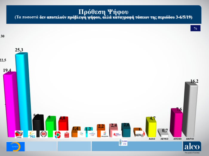 Ειδικότερα, 17 ημέρες πριν τις ευρωεκλογές, στην πρόθεση ψήφου, η ΝΔ λαμβάνει ποσοστό 25,3%, με τον ΣΥΡΙΖΑ να λαμβάνει ποσοστό 19,4%. Ακολουθεί η Χρυσή Αυγή με 5,5%, το ΚΙΝΑΛ με 5%, το ΚΚΕ με 4,8%.