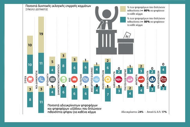 Στις προτιμήσεις των ψηφοφόρων ακολουθούν: Δημοκρατική Συμπαράταξη 11%, Χρυσή Αυγή και ΚΚΕ 9%, Ένωση Κεντρώων 8%, Ποτάμι 7%, ΑΝ.ΕΛ. 5%. Οι «αδιευκρίνιστες» ψήφοι ανέρχονται στο 24% και «αποχή», «άκυρο», «λευκό» στο 17%.
