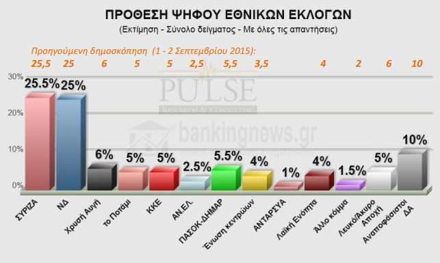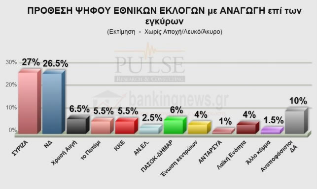 Οριακό προβάδισμα του ΣΥΡΙΖΑ έναντι της Νέας Δημοκρατίας καταγράφει η δημοσκόπηση της εταιρείας Pulse για το bankingnews.gr.