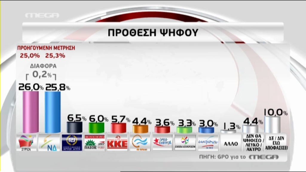 Οριακό προβάδισμα του ΣΥΡΙΖΑ έναντι της Νέας Δημοκρατίας καταγράφει η δημοσκόπηση της GPO για το MEGA