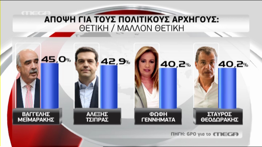 Όσον αφορά στη δημοτικότητα των πολιτικών αρχηγών, ο Βαγγέλης Μεϊμαράκης προηγείται συγκεντρώνοντας 45%. Ακολουθεί ο Αλέξης Τσίπρας με 42,9%, η Φώφη Γεννηματά και ο Σταύρος Θεοδωράκης με 40,2%, ο Δημήτρης Κουτσούμπας με 28,4%, ο Πάνος Καμμένος με 26,8%, ο Παναγιώτης Λαφαζάνης με 22,1% και ο Νίκος Μιχαλολιάκος με 11,5%