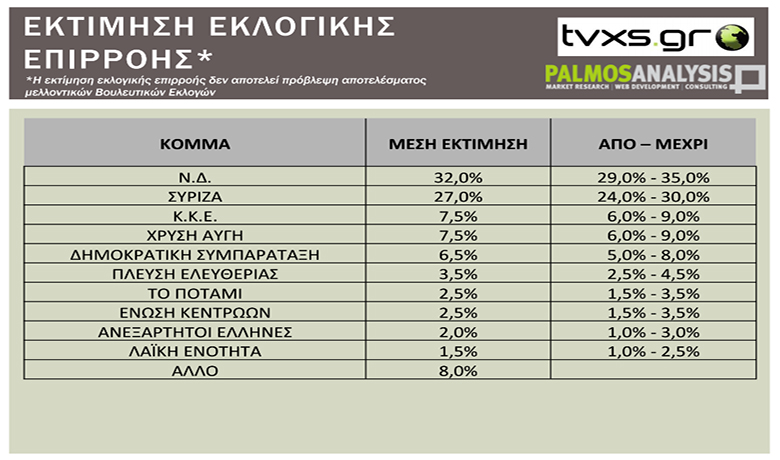 Προβάδισμα 8 μονάδων στη Νέα Δημοκρατία δίνει στην πρόθεση ψήφου η δημοσκόπηση της Palmos Analysis για το tvxs.gr.